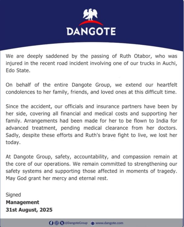 “We are deeply saddened by the passing of Ruth Otabor, who was injured in the recent road incident involving one of our trucks in Auchi, Edo State. On behalf of the entire Dangote Group, we extend our heartfelt condolences to her family, friends, and loved ones at this difficult time,” the statement read.