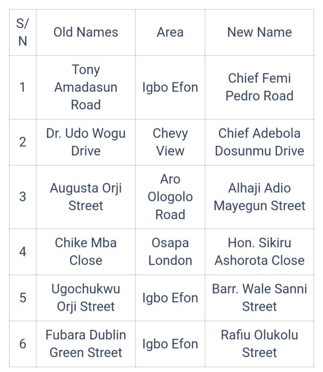Amid the controversies that followed the street renaming in some parts of Lagos, the Eti-Osa Local Government Area of the state has become the second to rename six streets within its territory. The move was part of its wider street naming and revalidation exercise.