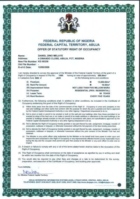 SaharaReporters has obtained right of occupancy documents granted to embattled Senator Dino Melaye for three separate properties in opulent neighbourhoods in the Abuja area during the last Peoples Democratic Party government of President Goodluck Jonathan.