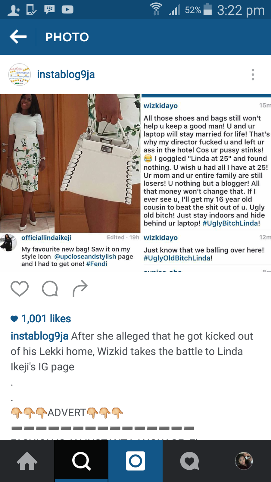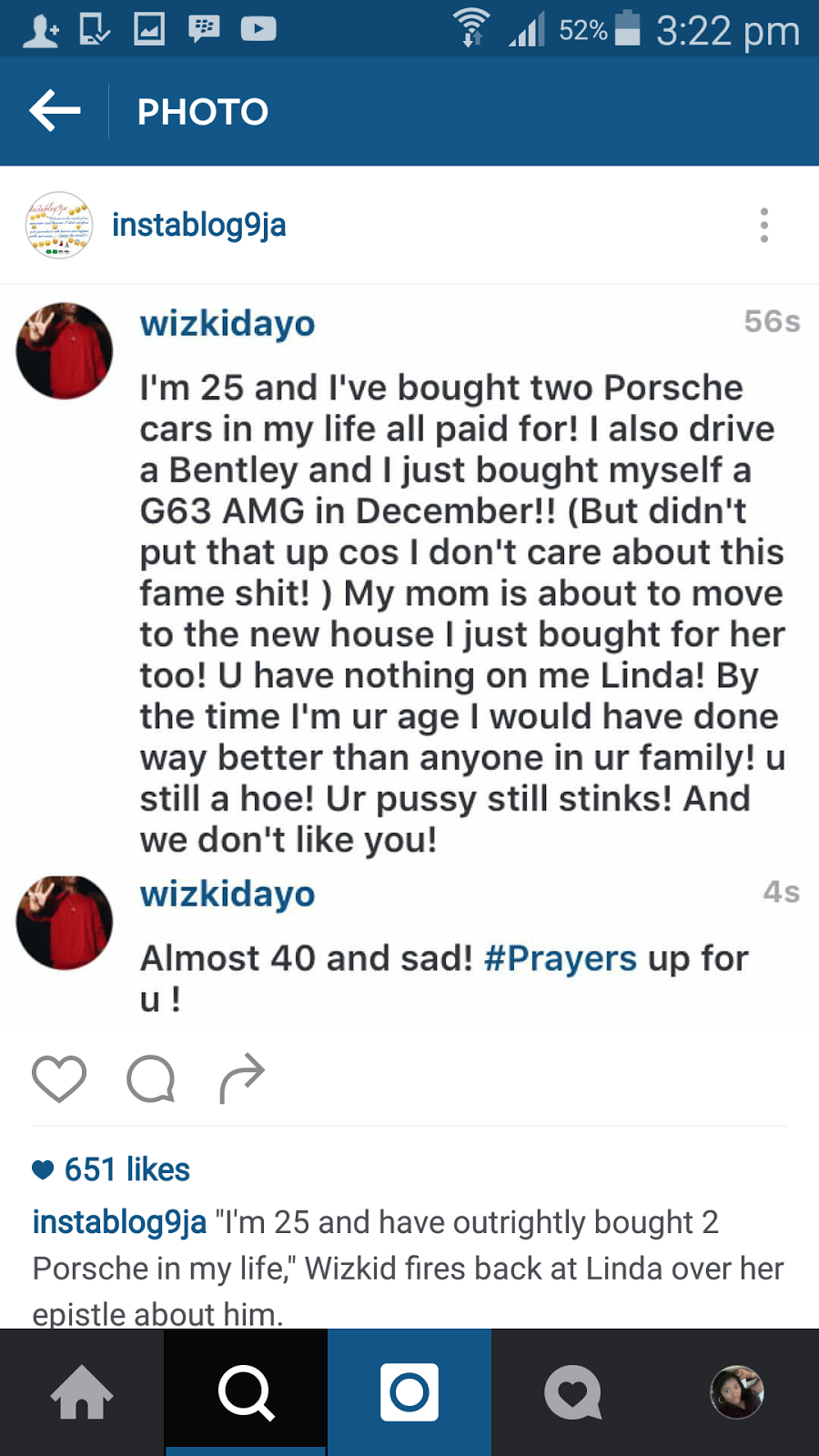 Wizkid took to Linda Ikeji’s Instagram page to vent his anger say, “all those shoes and bags still won’t help you keep a good man! You and your laptop will stay married for life! That’s how my director f**ked you and left you’re ass in the hotel because your p***y stinks…”